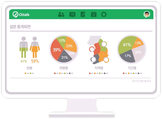 오이웍스에서 다문항, 다답형 ,단답형 등 다양한 형태의 설문조사를 손쉽게 생성 할 수 있습니다. 오이톡에서 안전하게 설문조사를 참여 할 수 있습니다. (1)지역별, (2)연령별, (3)성별, (4)기간별 등 다양한 형태의 통계자료를 제공합니다.