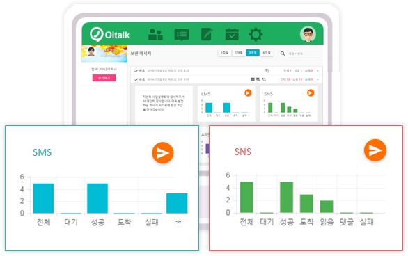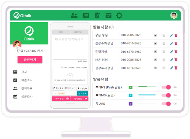 오이톡과 연계해 카테고리, 개별전송, 예약전송, 발송 유형별 (문자, PUSH, ARS, E-MAIL)로 고객의 연락처를 자동으로 분류해 발송할 수 있습니다.