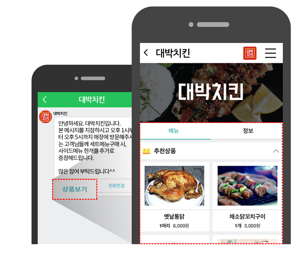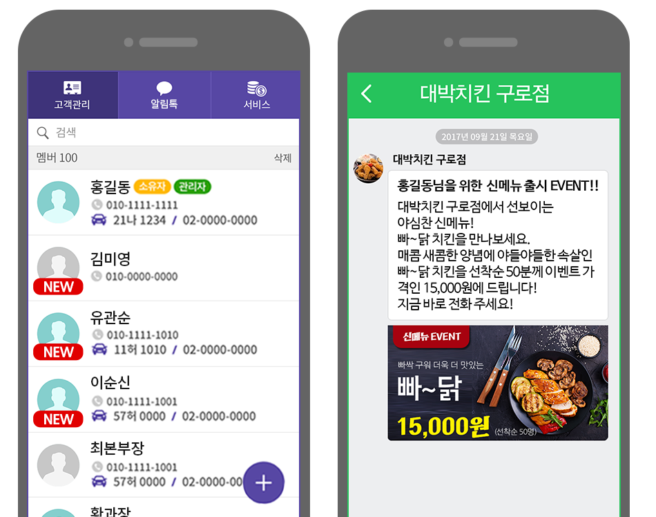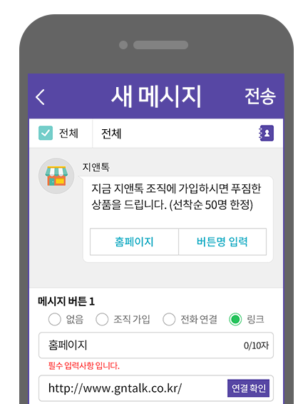 효과적으로 멤버 또는 고객을 모집할 수 있는 다양한 홍보 도구를 제공합니다. 알림톡에서 메시지 버튼을 제공해 “전화연결”, “홈페이지 링크 전송”, 업체의 다양한 제품을 볼 수 있는 “상품보기” 화면을 연결할 수 있는 제작 도구를 제공합니다.