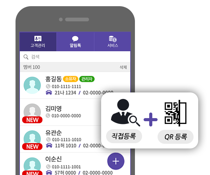 방법1. 고객이 주차안심전화를 통해 업체의 QR코드를 찍으면 자동으로 오이천사 앱의 고객관리 화면으로 등록됩니다.