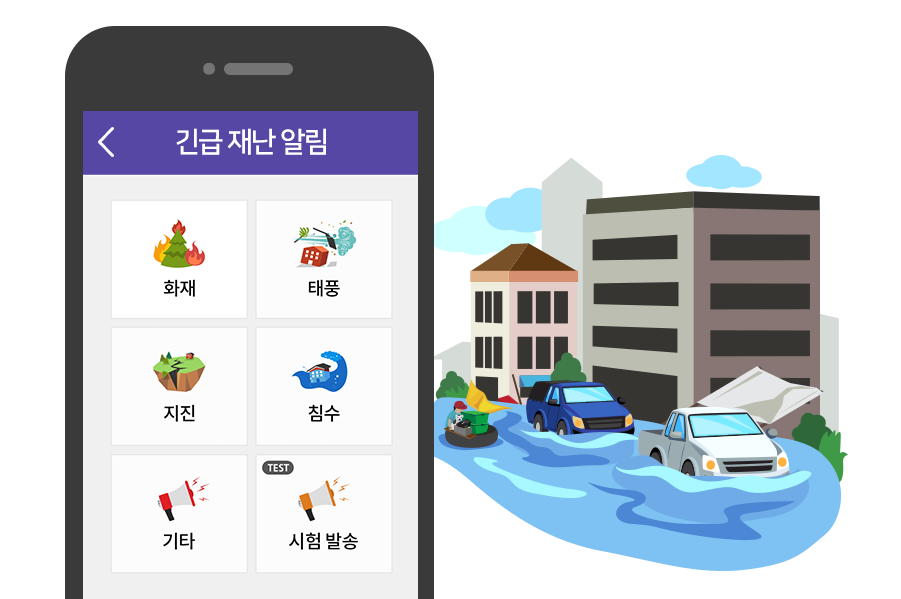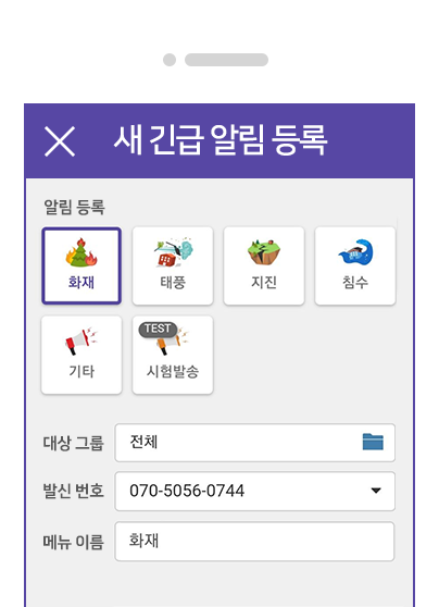 재난 또는 긴급 알림 종류에 따라 설정 및 등록이 가능하며, 긴급 알림자를 지정해서 지정된 사람이 전체에게 긴급(재난)알림을 보낼 수 있습니다.
