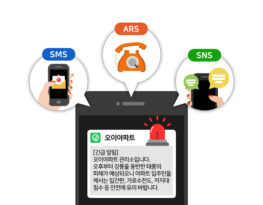 화재, 태풍, 지진, 침수, 정전 등 방송이나 인터폰으로 알림이 불가능한 긴급상황일 경우 오이천사 통합메시지를 통해 원 클릭으로 중복 및 누락 없이 발송이 가능합니다.